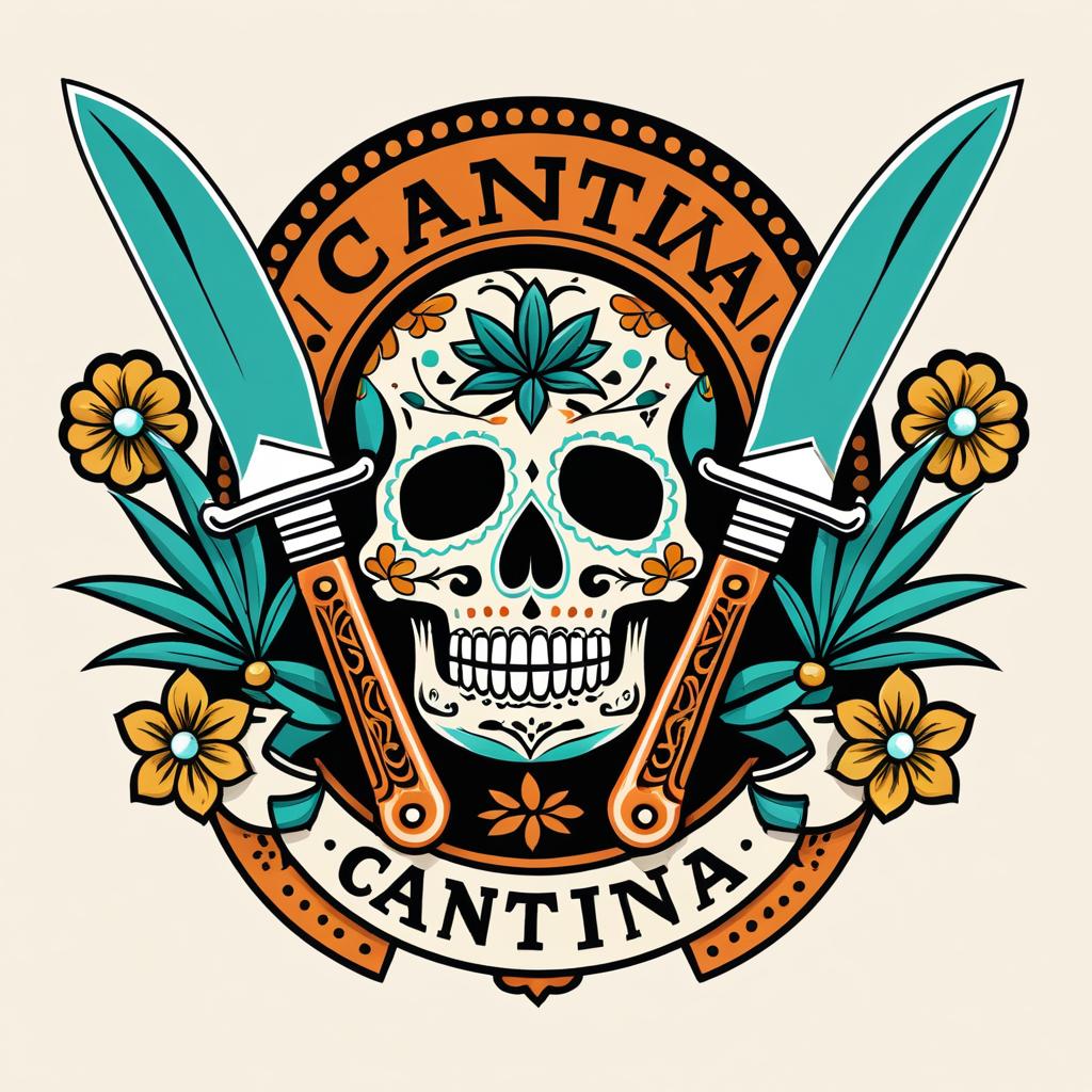 A retro Mexican cantina logo containing a pair of retro gangster penknives crossed and facing downwards with hand-painted Talavera handles, in retro pastel colors (turquoise, burnt orange, cream, and mustard), with agave plants, sugar skulls, and maracas, design, digital design, logo design, HD, canon, high quality, art, sketch, graphic design.
