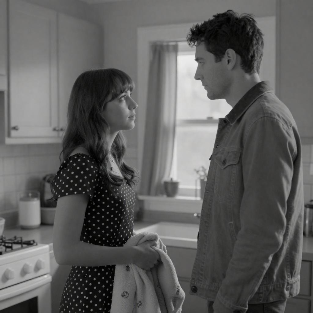 A photograph of a man and a woman standing indoors. The man, on the left, wears a brown flat cap, a plaid shirt, and dark blue jeans with a brown belt. He has a medium build and is leaning against a wall with his right hand on his hip, looking at the woman with a slight smile. The woman, on the right, has shoulder-length brown hair and is wearing a yellow long-sleeve shirt under a red and white checkered dress. She is smiling back at the man, standing with her hands behind her back. The background includes a white wall,