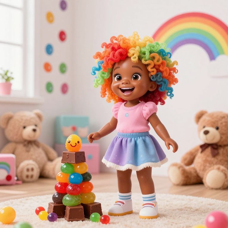 A playful candy girl with shiny, glossy skin, large expressive eyes, and curly, candy-colored hair, laughing in a bright indoor playroom filled with plush teddy bears, jelly bean wallpaper, and a candy rainbow mural on the wall, standing next to a stack of colorful gumdrops and chocolate fudge blocks.