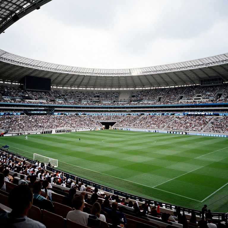 Photograph of a large, modern football stadium packed with spectators. The green, well-maintained grass field is centered, with white goalposts on the left. Players in white and red uniforms are scattered across the field. The stadium's roof is partially visible, and a bright, clear sky is above. The stands are filled with a diverse crowd, creating a sea of colors. In the foreground, spectators sit in darkened seats. The overall scene is vibrant, capturing the energy and excitement of a live football match.