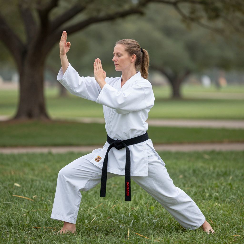Woman meditating outdoors in a serene park setting, wearing a crisp white martial arts uniform with a black belt, embodying tranquility and focus during her practice session in Angleton, TX.