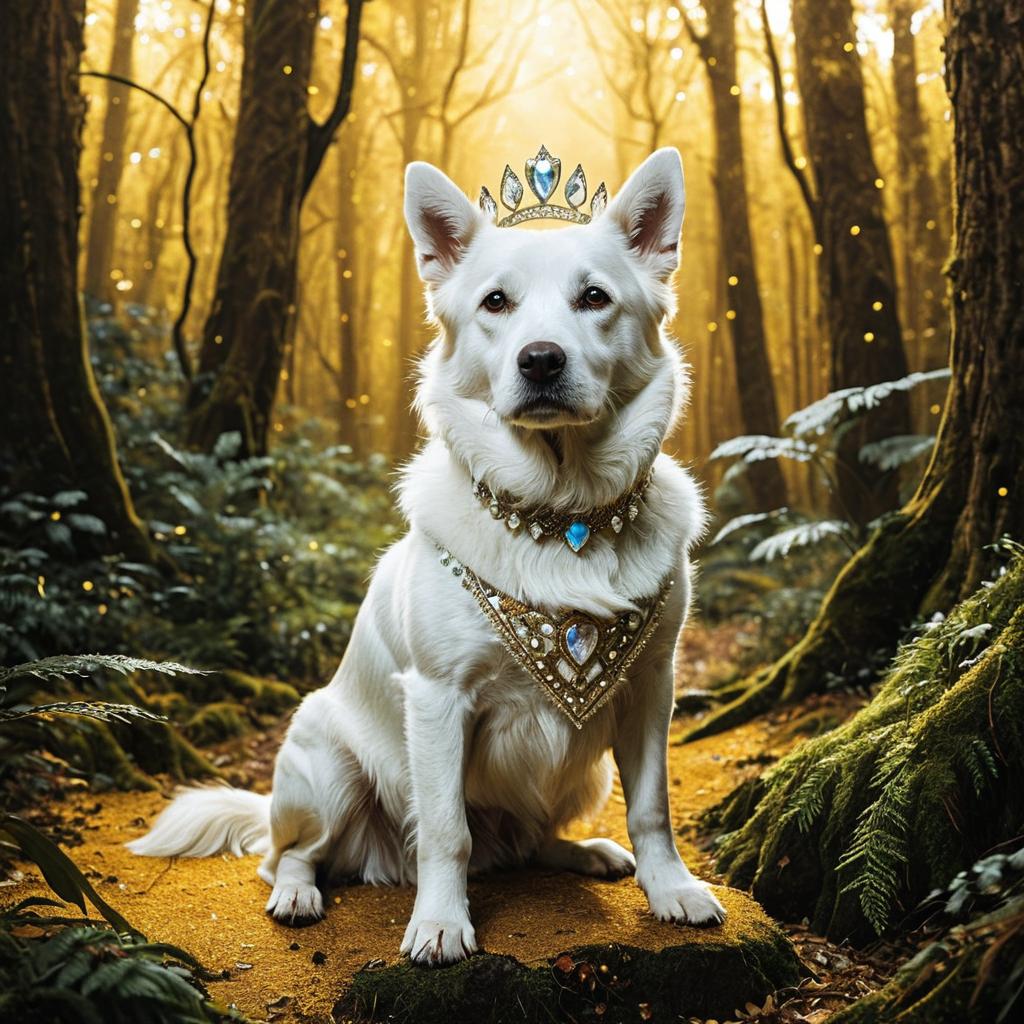 Digital illustration of a white long-haired cat sitting amidst a field of daisies and purple flowers. The cat has striking purple eyes and wears a crown of purple flowers on its head along with a matching flower necklace. The background is a vibrant gradient of purple hues enhancing the floral and mystical atmosphere.