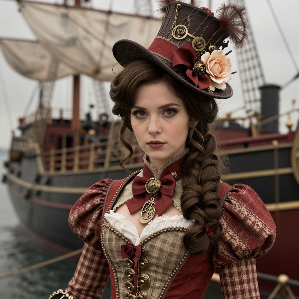 (ultra realistic:1.3), (intricate details:1.3), (highres:1.3), a cute 20yr old, 1girl with (small breasts:.5), (extremely detailed face and eyes:1.5)steam punk, red and beige, rococo, steampunk era, steam ship, elegant flowers, a gorgeous brunette, (steampunk_costume:1), corset, hat, check the images for more