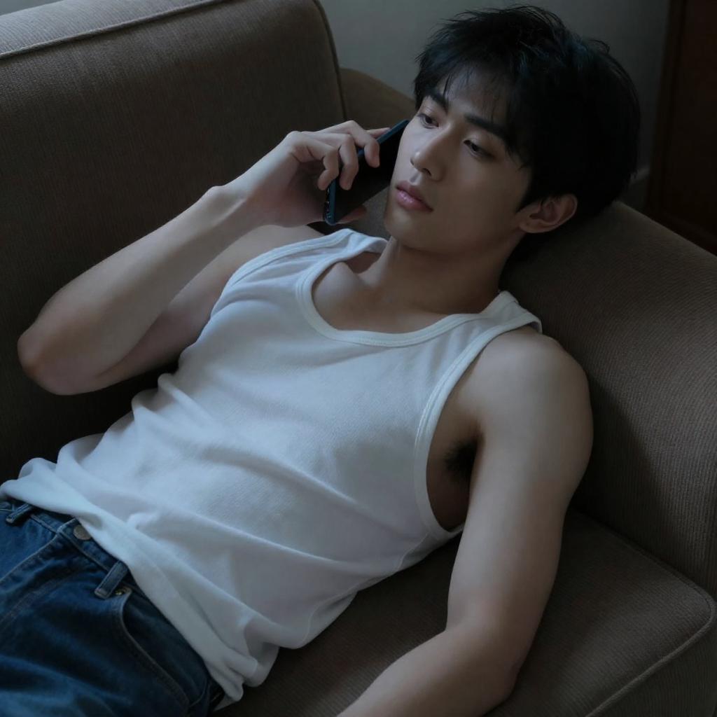 Young man with short dark hair in white tank top and underwear, sitting on toilet in dimly lit bathroom, intensely focused on smartphone. Shelves with toiletries in background. Blue-tiled walls, white toilet, black towel hanging.