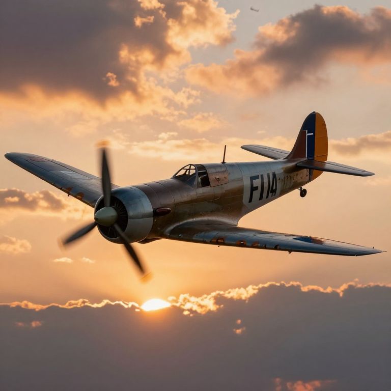 Fa44 vintage fighter aircraft in mid-air battle, detailed with worn metal textures, propeller spinning fast, vibrant sunset sky with dramatic clouds and smoke trails, evoking intense aerial combat and historical aviation scenes