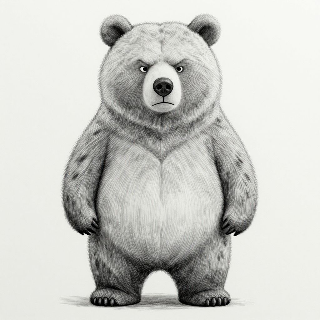 Extreme Close-Up Shot On The Model, draw me a bear with full body, grumpy, in detailed black pencil line,