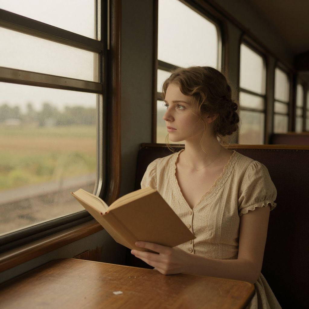 Photograph of a young Caucasian woman with fair skin and brown hair in an updo, wearing a cream, vintage-style dress with short sleeves and a lace collar, sitting in a dimly lit train car. She is gazing out the window to her right, holding an open book on her lap. The window reveals a blurred, green, and brown countryside outside. The train's wooden interior has a warm, nostalgic feel, with soft, natural light illuminating her profile. Her expression is calm and contemplative.