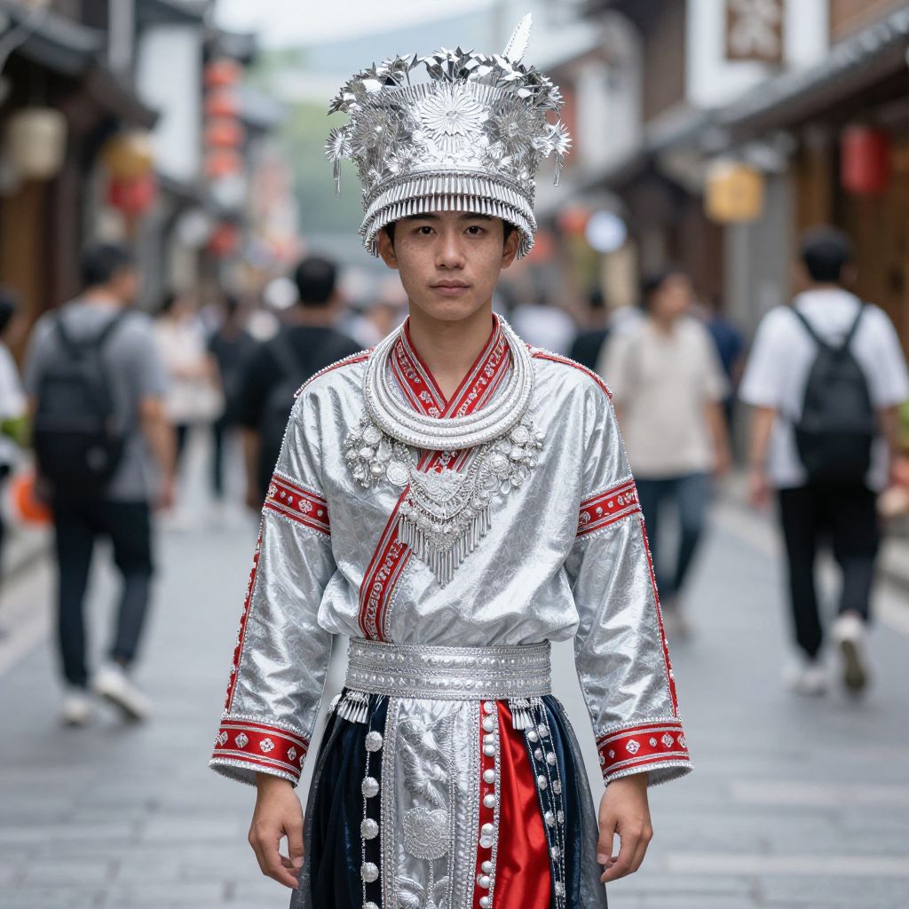 Photograph of an Asian male standing in a busy, narrow street. He wears a silver, intricately embroidered traditional Chinese costume with red trim, a tall, silver, beaded hat, and black and red patterned pants. The street is blurred with people in modern clothes walking in the background. The man's expression is neutral, and the street is lined with traditional buildings, visible through the blurred background. The image has a vivid, slightly surreal quality due to the bright costume against the muted street scene.