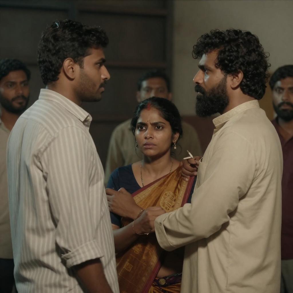 Photograph of a tense scene with five people. A man in a striped shirt stands facing a bearded man in traditional clothing. A woman with dark hair is being held by a man with curly hair. Background includes more people, dim lighting, and industrial setting. The woman's expression is intense. The curly-haired man holds a cigarette.