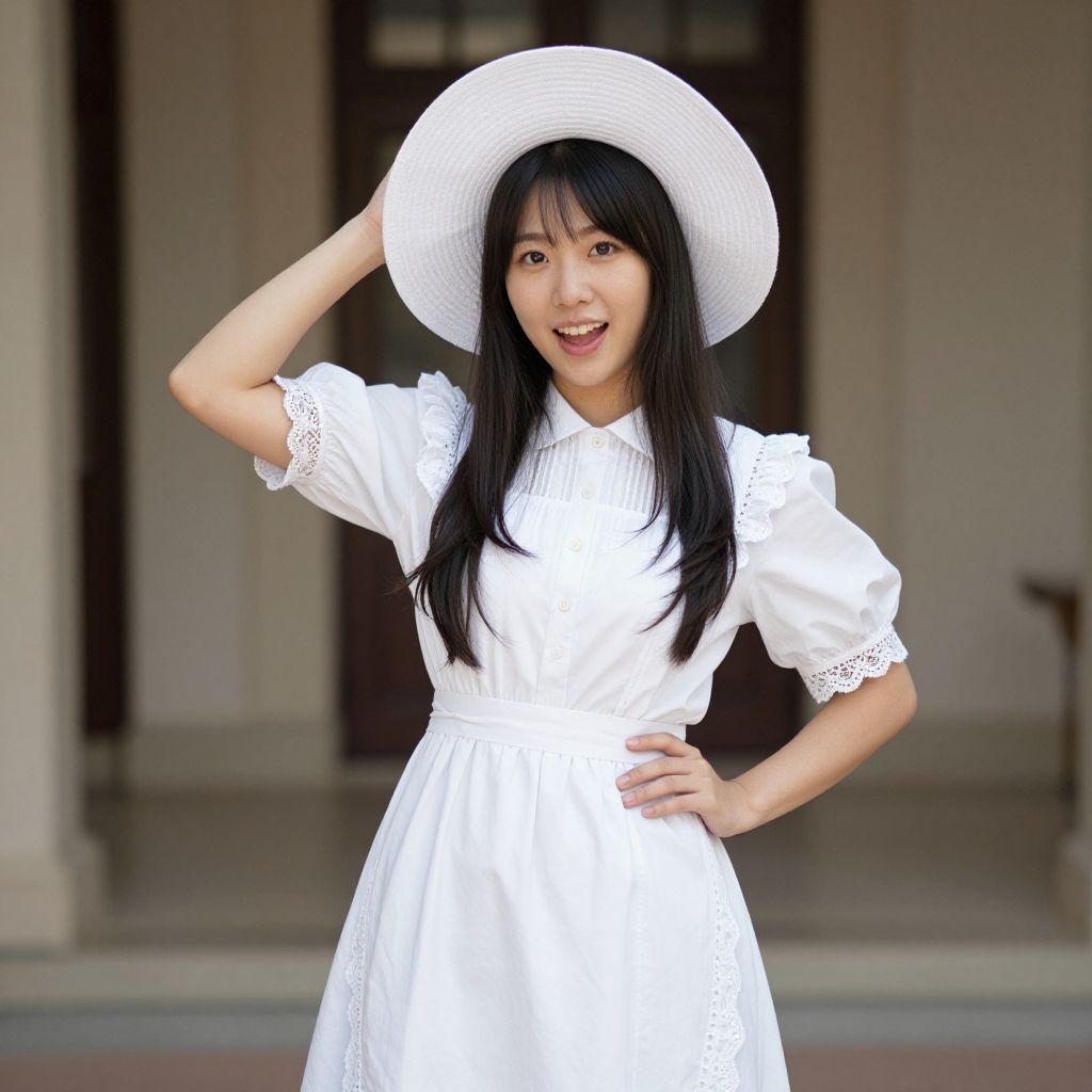 French Maid Costume Woman, woman in a white dress and hat posing for a picture