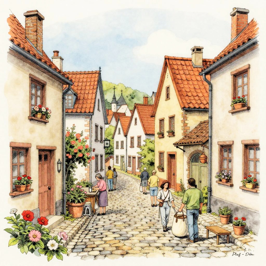 Drawing:qvpupmkyn3i= capturing an old-world European village street scene, cobblestone paths lined with quaint houses, detailed pen and ink style with soft watercolor washes providing warmth and nostalgia, villagers going about daily routines amid blooming flowers