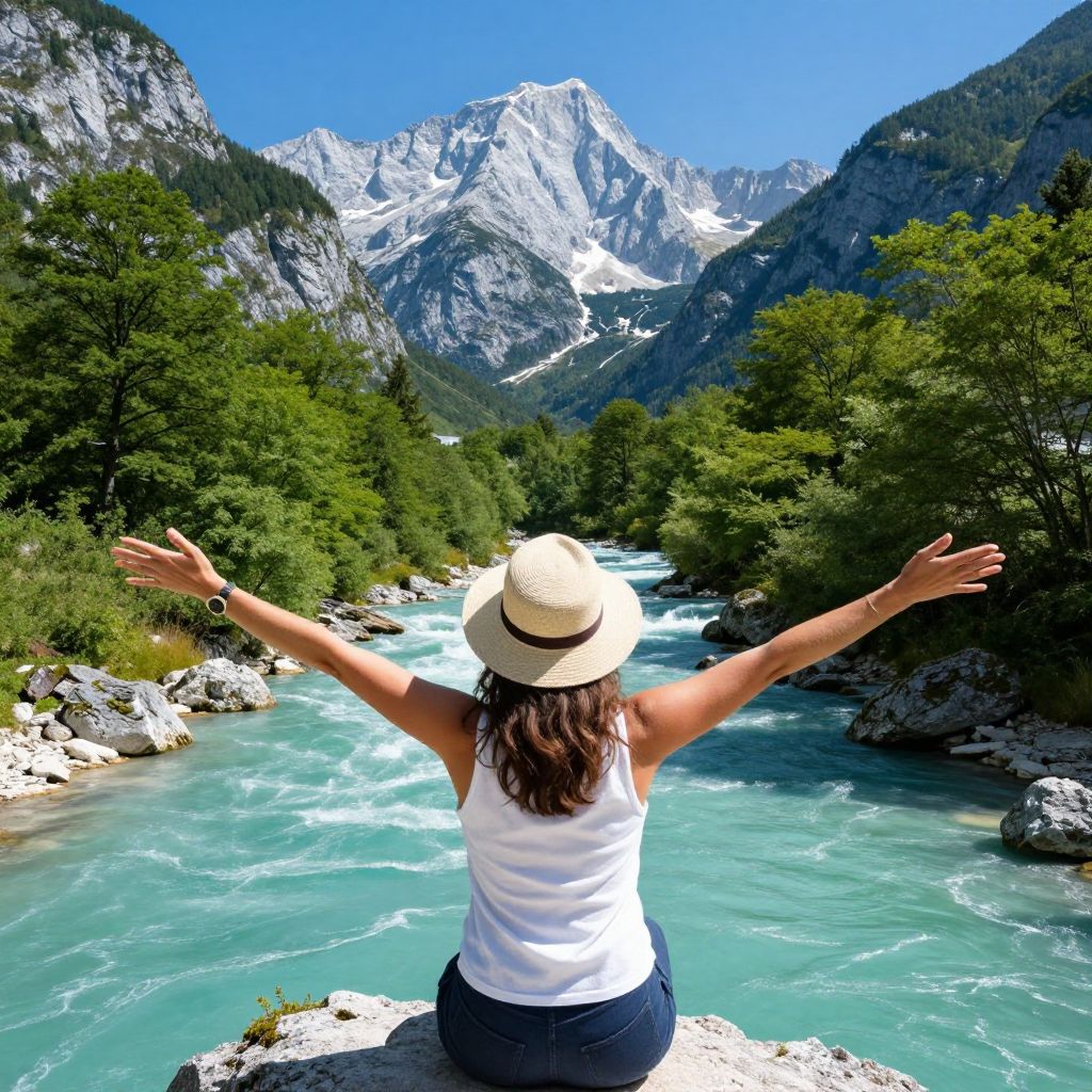 Woman embracing the breathtaking Soca Valley in Slovenia, with arms outstretched against a vibrant turquoise river flanked by lush green forests and towering mountains under a clear blue sky.
