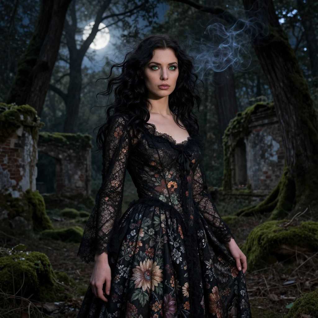 A captivating female figure with dark, wavy hair flowing like smoke, her intense green eyes holding untold mysteries. Dressed in a weathered black lace gown adorned with hardy floral patterns reminiscent of old-world paintings, she blends seamlessly into the moonlit forest backdrop. As the ancient trees tower over moss-covered ruins, ethereal shadows dance along her face and dress, creating an air of intrigue and allure. The interplay between this otherworldly scene and the human subject evokes a sense of longing for a past that is both real and imagined, inviting viewers to reflect on time's passage and the beauty within decay.
