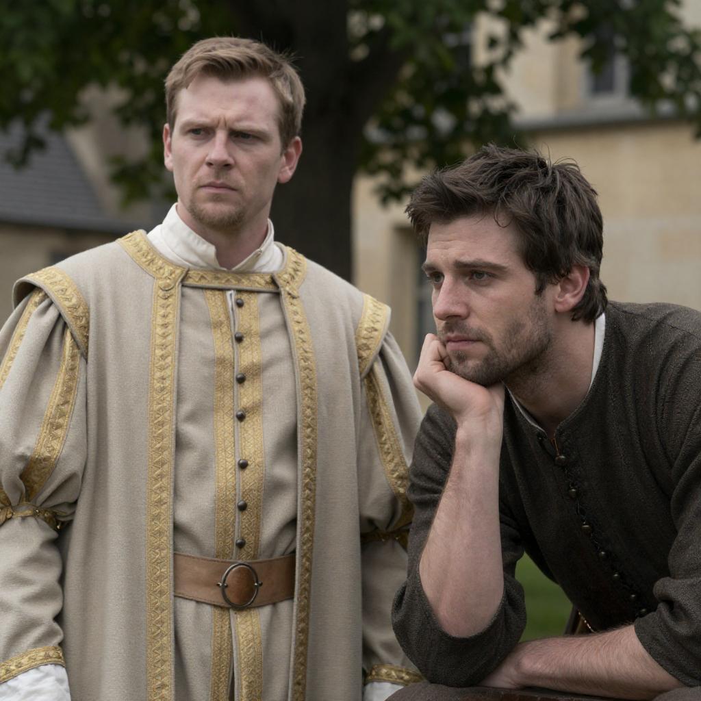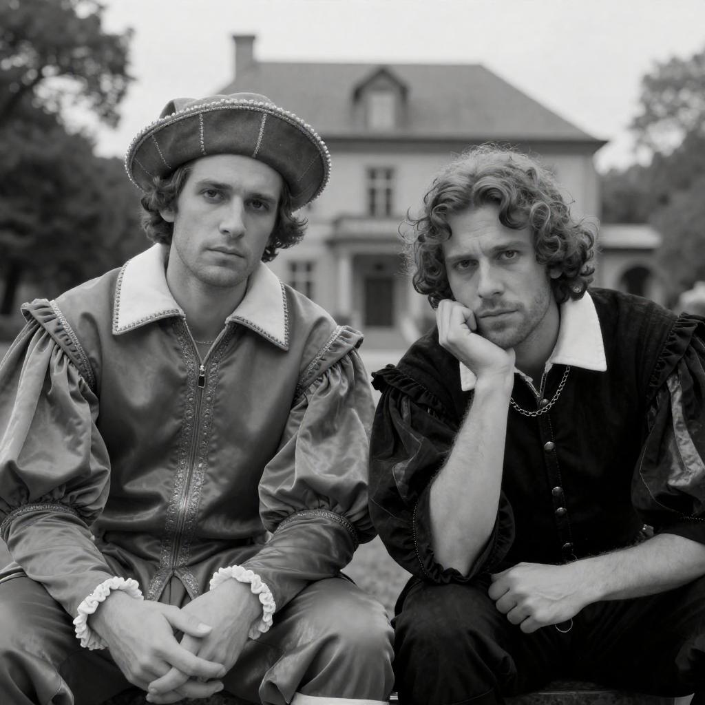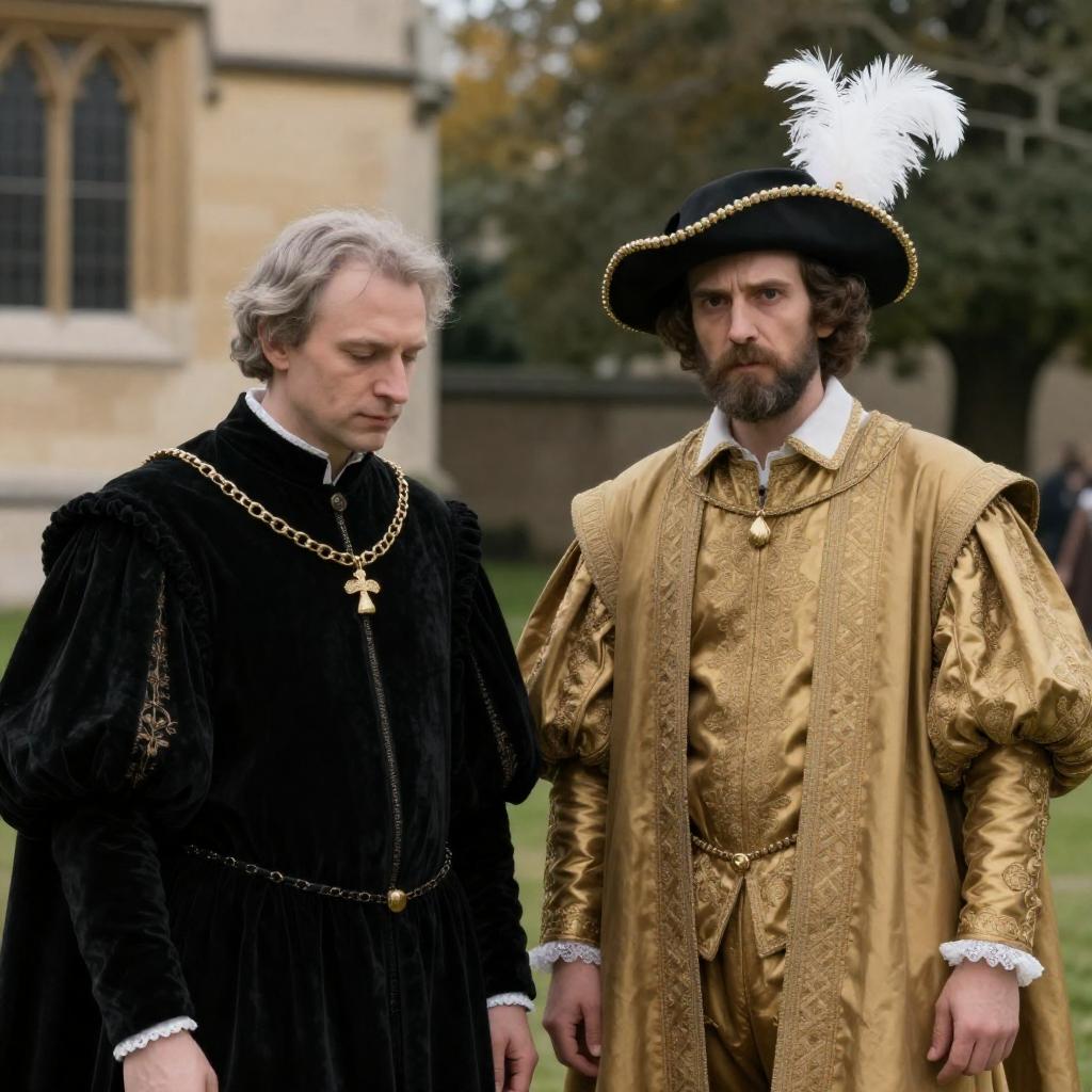 Photograph of two men in 16th-century attire. Man on left has blonde beard, gold-trimmed black robe, black cap, serious expression. Man on right has dark hair, black robe with gold chain, thoughtful expression, chin on hand. Background: tree branches, stone building. Both men seated. Bright daylight.