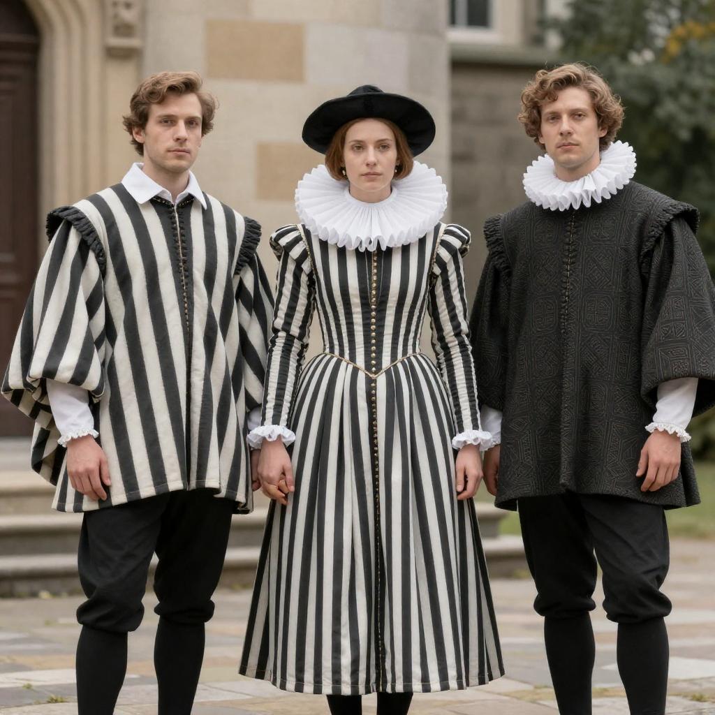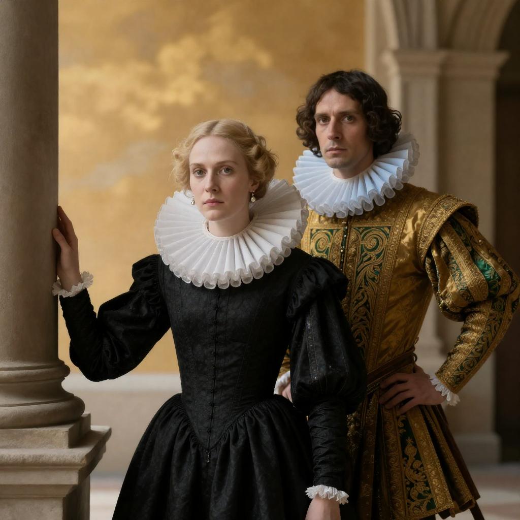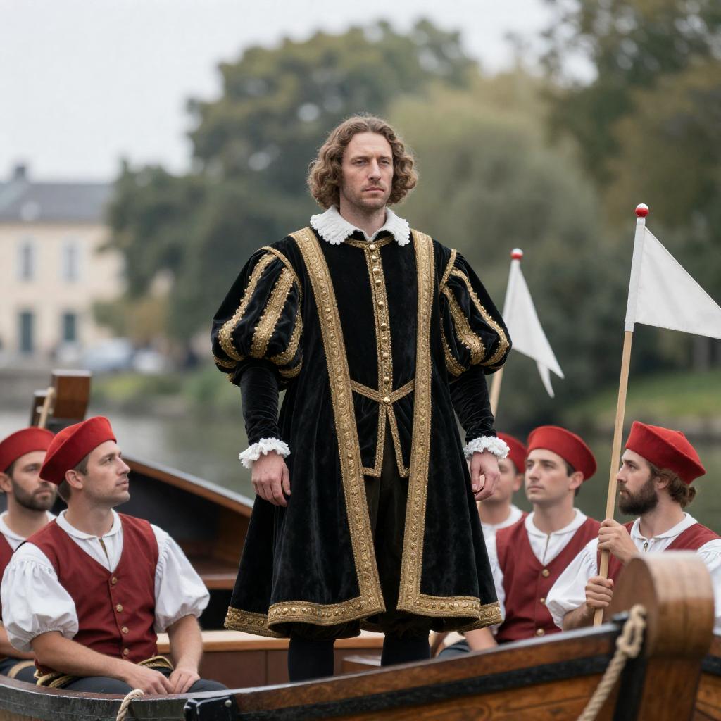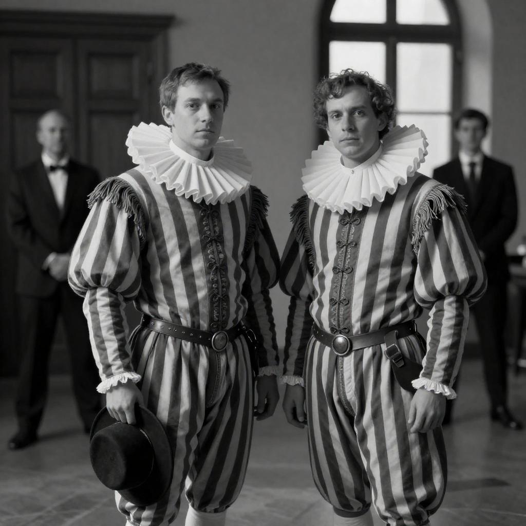 Photograph of two men in 16th-century attire. Man on left has blonde beard, gold-trimmed black robe, black cap, serious expression. Man on right has dark hair, black robe with gold chain, thoughtful expression, chin on hand. Background: tree branches, stone building. Both men seated. Bright daylight.