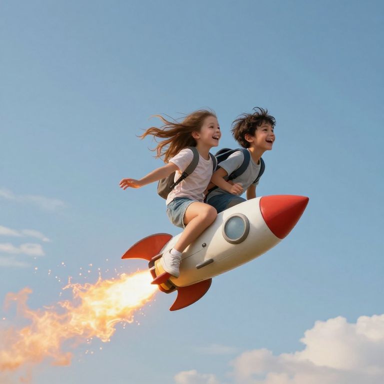 Two joyful children soar through the sky atop a vibrant red pencil rocket, trailing golden flames and flanked by large, feathered wings.