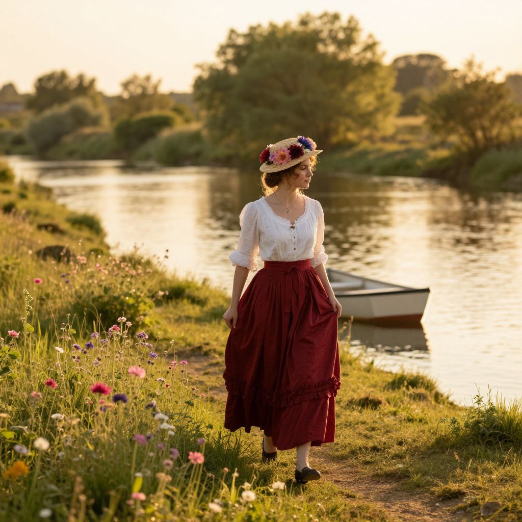 In this enchanting, ethereal scene, a woman dressed in a Victorian-era gown and hat, adorned with vibrant flowers, gracefully strolls by a serene river. Her attire, a harmonious blend of white blouse and deep red skirt, is complemented by a straw hat decorated with colorful blooms, exuding a sense of nostalgia and elegance. The golden hour bathes the landscape in warm, golden light, casting long shadows and highlighting the intricate details of the scene. Wildflowers, in shades of pink, purple, and white, dot the verdant grass, adding a touch of whimsy and natural beauty. A small boat rests gently on the water's surface, its presence subtly suggesting a journey or a moment of tranquility. The composition is masterfully crafted, with the woman positioned centrally, her figure aligned with the river and the boat, creating a balanced and visually appealing arrangement. The overall effect is one of magical realism, where the boundaries between reality and fantasy blur, evoking a sense of wonder and enchantment.