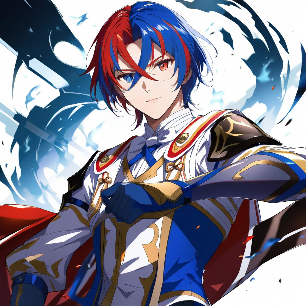 Alear (male) (fire emblem), fire emblem, 1boy, heterochromia, red eyes, blue eyes, hair between eyes, red hair, blue hair, two-tone hair, short hair, split-color hair, crossed bangs, long sleeves, by artist satomi (black scarecrow), animagine