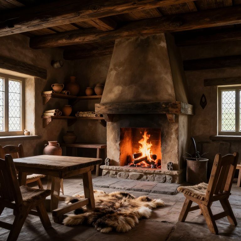 Medieval cabin interior featuring rough-hewn timber walls, a large hearth with crackling fire, simple handmade wooden chairs and table, fur rugs on stone floor, shelves lined with clay pots and scrolls, dim natural light filtering through leaded glass windows.