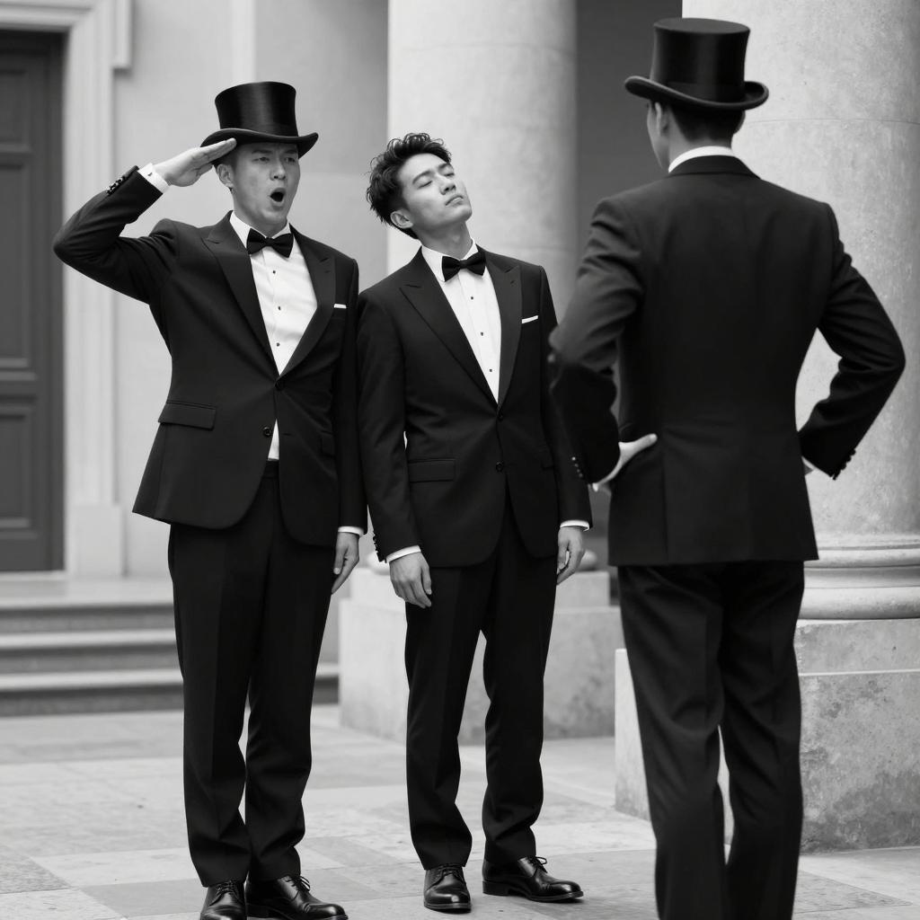 Black and white photograph. Three men in a hallway. Two men in formal black suits with bow ties and one in a top hat and suit. First man on left salutes with hat, mouth open. Second man in center leans against first man, eyes closed. Third man on right stands with hands on hips, facing away. Background has stone walls and steps.