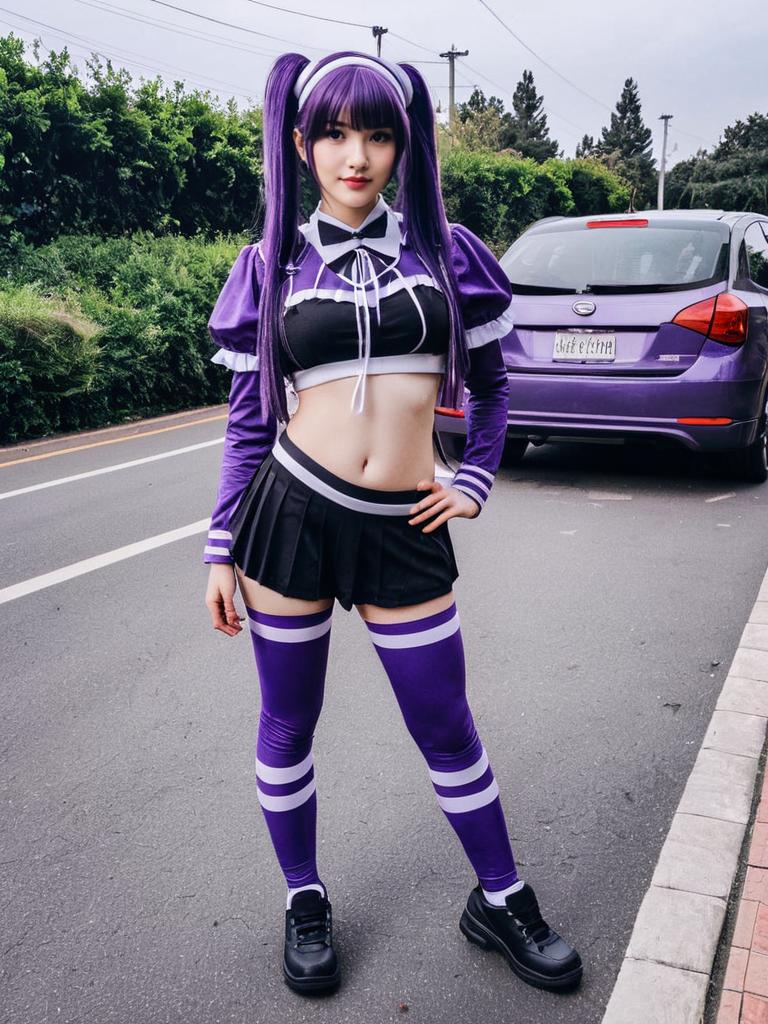 Full-length photo of a woman in a purple and black Carro Pino cosplay costume standing on a paved road with greenery and a purple car in the background. She has long purple hair styled in low twintails with a matching headband, and striking purple eyes. The outfit consists of a cropped top with a bow tie and puffy sleeves, a short pleated skirt, thigh-high purple stockings with white stripes, and black platform shoes. The scene appears to be outdoors in a suburban or park area.