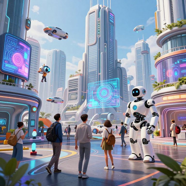 Digital artwork of a futuristic city with towering skyscrapers, flying cars, and a humanoid robot. People in casual clothes walk on a neon-lit