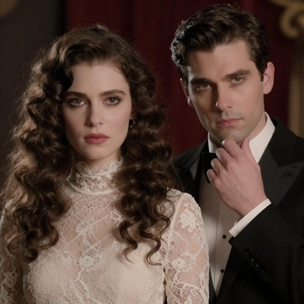 Photograph of a movie poster. A man with dark hair in a blue suit holds a microphone close to a woman with long brown hair, who has an intense, frightened expression. Blue background with white and red . Two people.