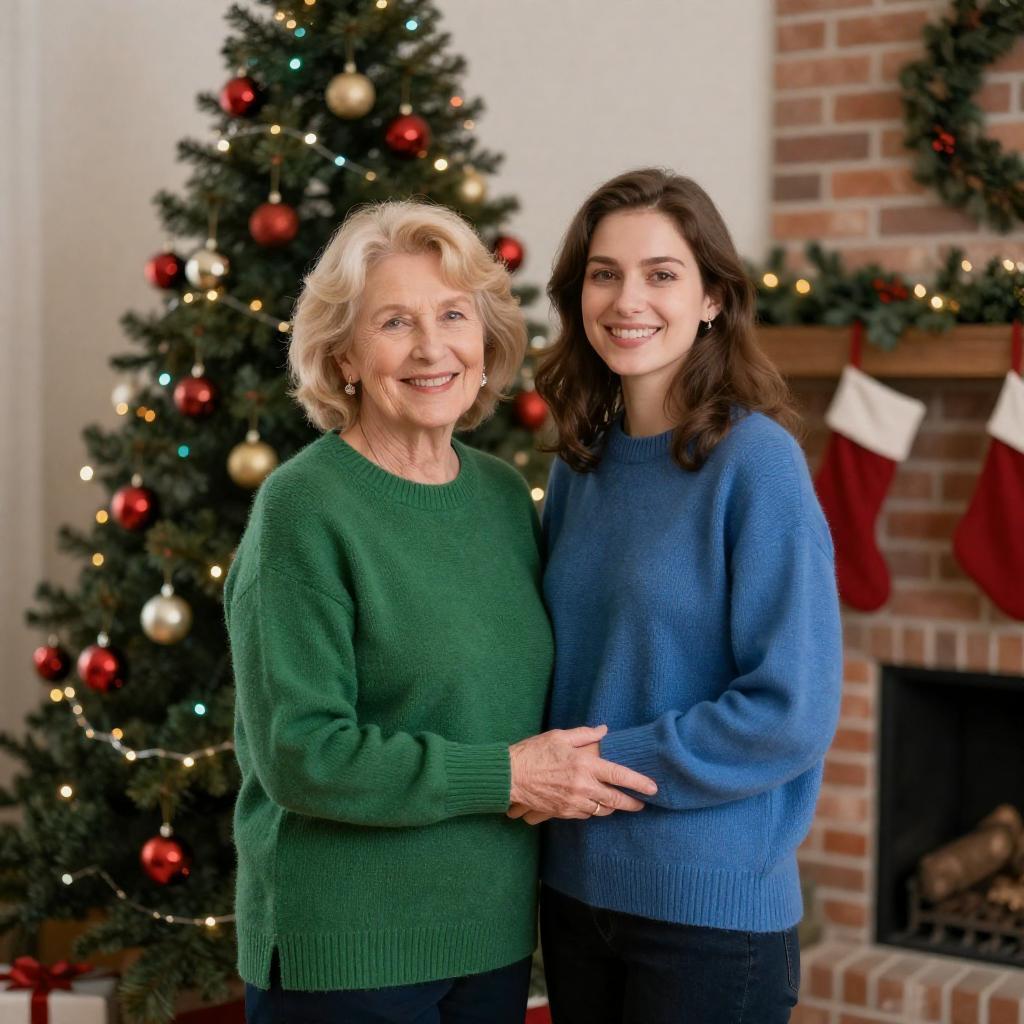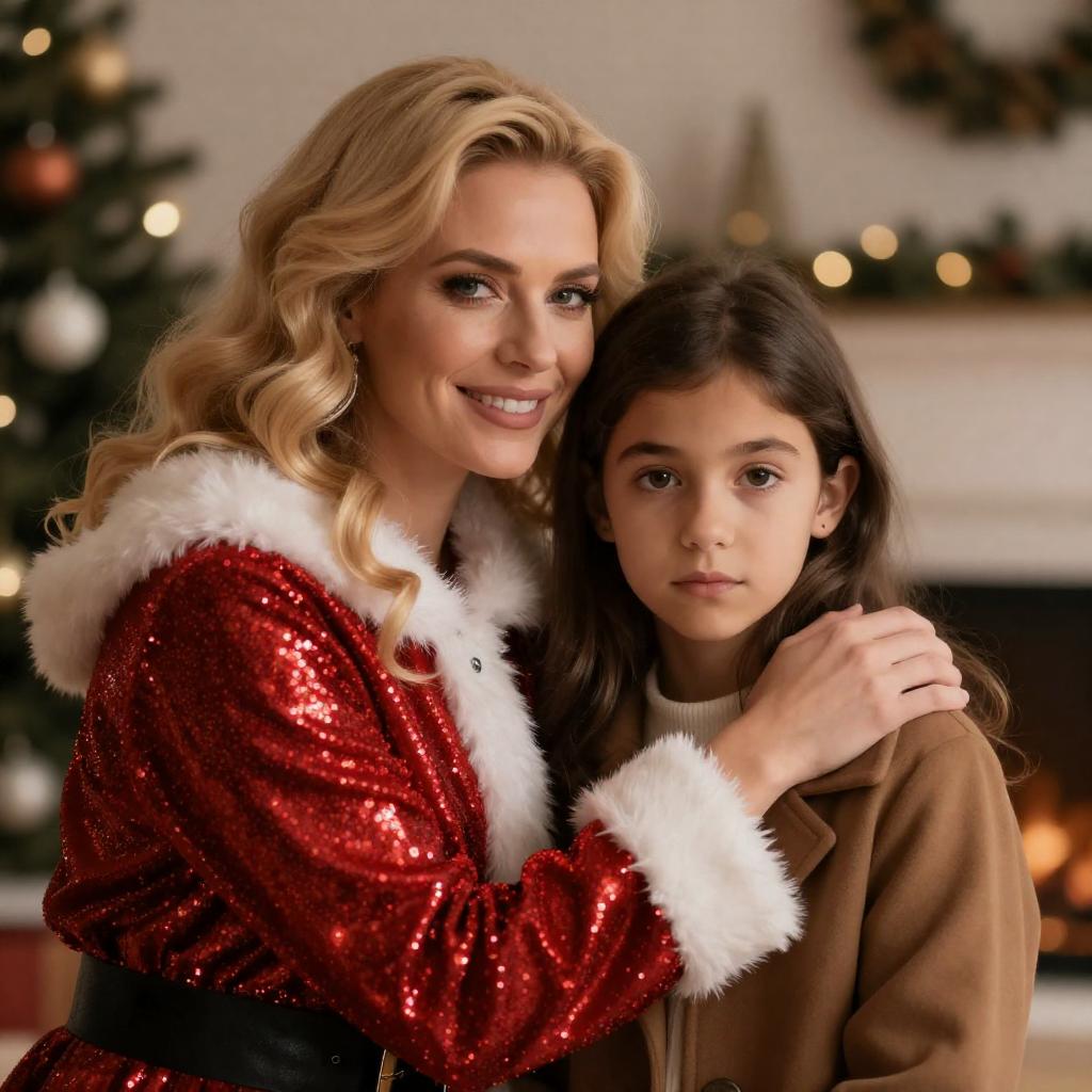 Photograph of Santa Claus with a white beard and red suit, sitting next to a smiling woman in a purple and beige outfit, and a young girl in a red shirt with a holiday design. All three sit on a red sleigh. Green canopy and Christmas lights in the background. Woman wears a red headband. Santa's left hand rests on his lap, woman's right hand on the sleigh's edge. Girl's right hand on Santa's arm. Bright sunlight.