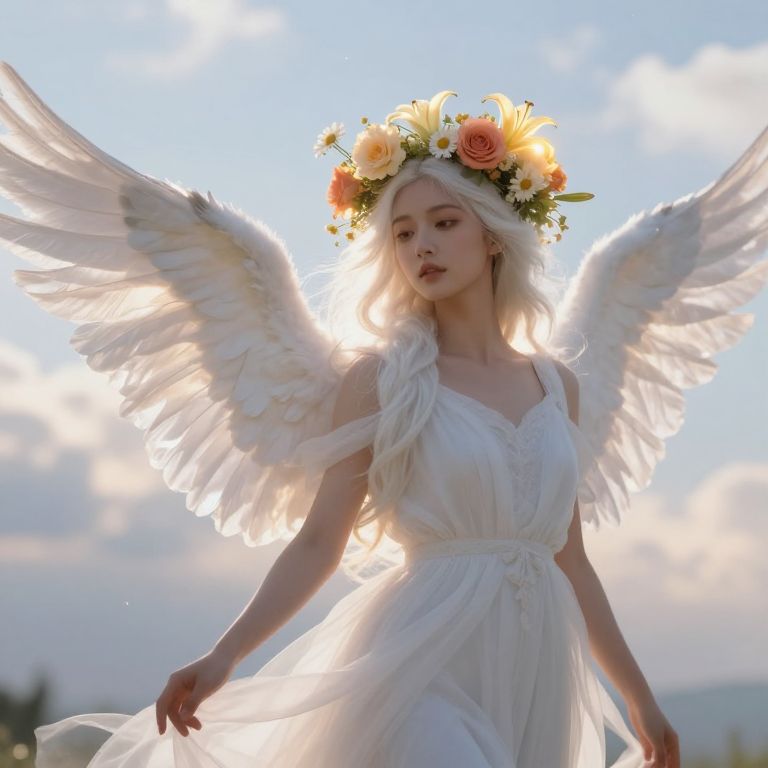 A beautiful female angel with soft, ethereal white wings gently spread out, glowing with a subtle golden light, standing in a serene heavenly landscape. She has long, flowing silver hair that cascades down her back, and delicate, serene facial features with large, compassionate eyes. Delicate flowers—pale pink roses and white lilies—are gently woven into her hair, glowing softly with a faint celestial radiance. The background features a heavenly sky with soft clouds and a gentle sunrise, creating a peaceful and divine atmosphere.