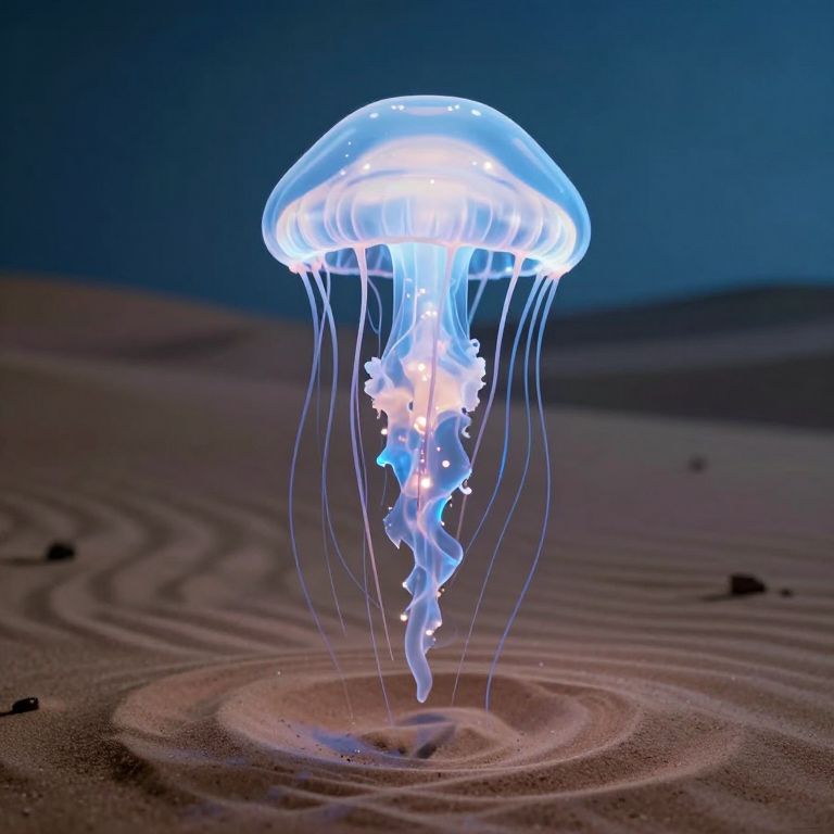 A mesmerizing digital artwork depicts a luminous jellyfish hovering over a serene desert oasis, its bioluminescent glow casting ethereal ripples across the sand, blending surreal fantasy with high-definition detail in a cyberpunk-inspired aesthetic.