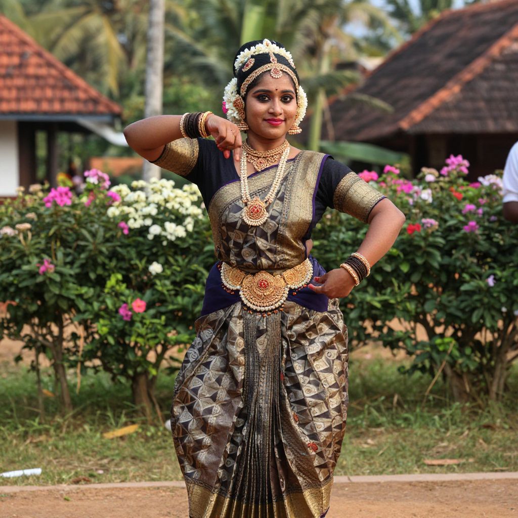 A detailed, naturalistic photograph of a woman in a rich Thiruvathira dance costume, including a finely embroidered blouse, a draped saree with traditional geometric patterns, and a floral headdress, performing a graceful step in front of a backdrop of flowering hedges and greenery in a rural Kerala village, her face is soft and expressive with a warm smile, capturing the essence of cultural heritage.. The woman has big tits and cute face