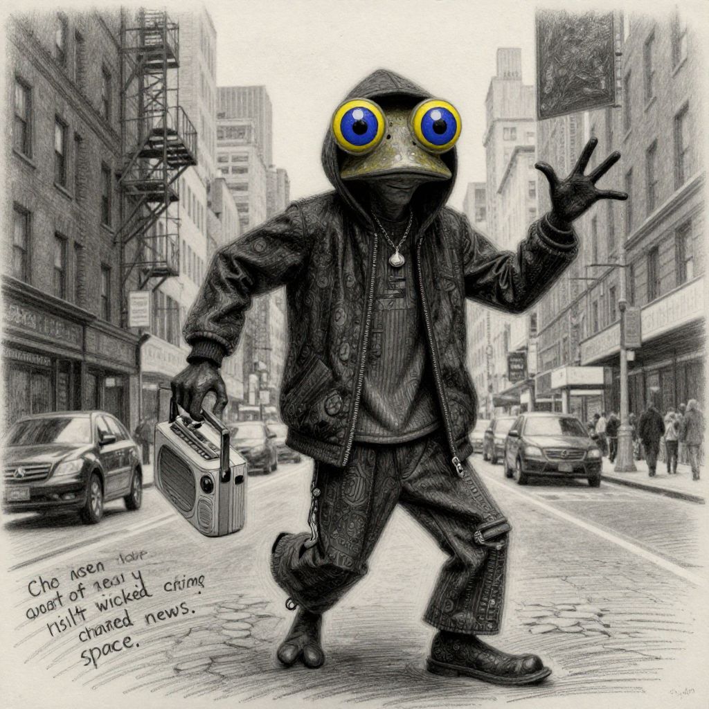"Charcoal Drawing a boogey man with big blue and yellow frog eyes thing hands and legs wearing snoop dog outfit dancing on the streets of newyork holding a wicked radio chattering space news,"
