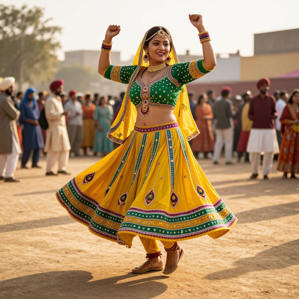 Photograph of an Indian woman dancing in a sunny, rural outdoor setting. She wears a vibrant green and yellow traditional lehenga choli with polka dots and intricate embroidery, paired with a yellow dupatta. Her hair is adorned with a red bindi and she wears gold jewelry, including earrings and a necklace. She raises her arms in a joyful pose, smiling brightly. The background shows a group of people in colorful traditional attire, standing on a dirt ground. The sunlight casts warm shadows, enhancing the vivid colors of her outfit and the scene.
