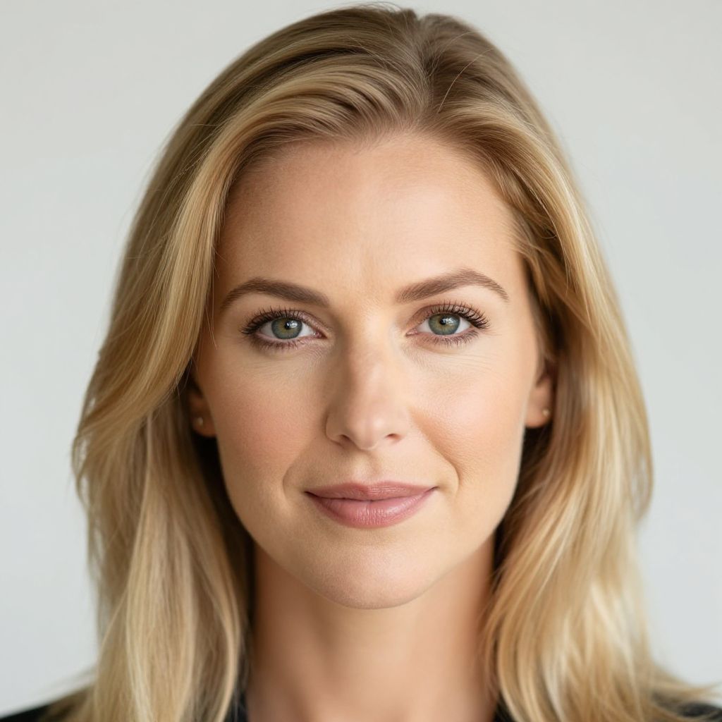 Professional blonde headshots of a confident woman with soft natural lighting, clean background, sharp focus on facial features, capturing a warm and approachable expression.