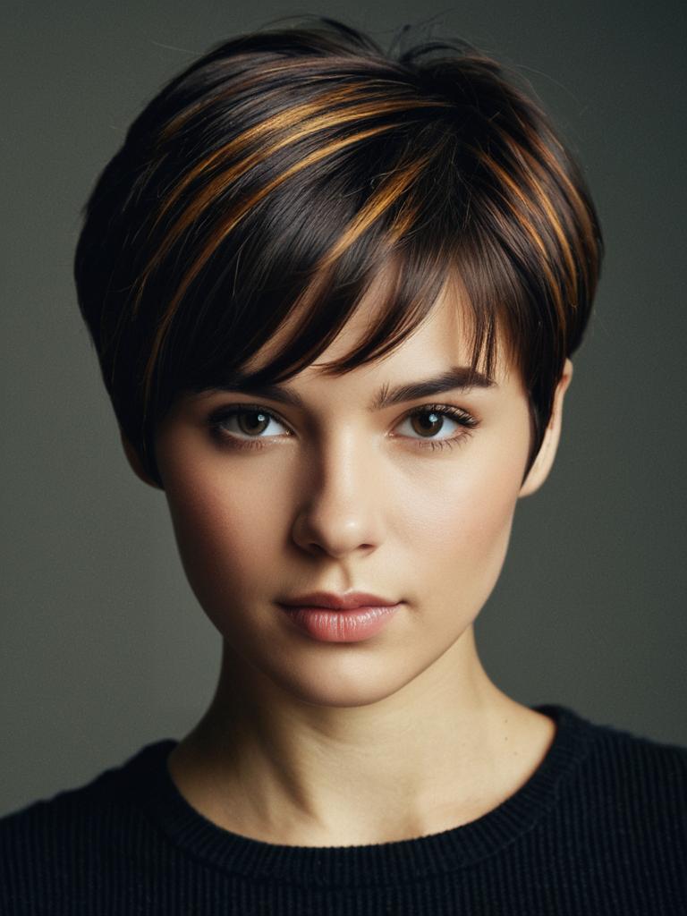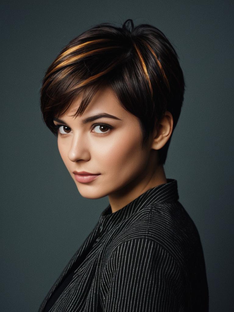Woman with Dark Brown Pixie Cut, waist-up fashion portrait with caramel highlights