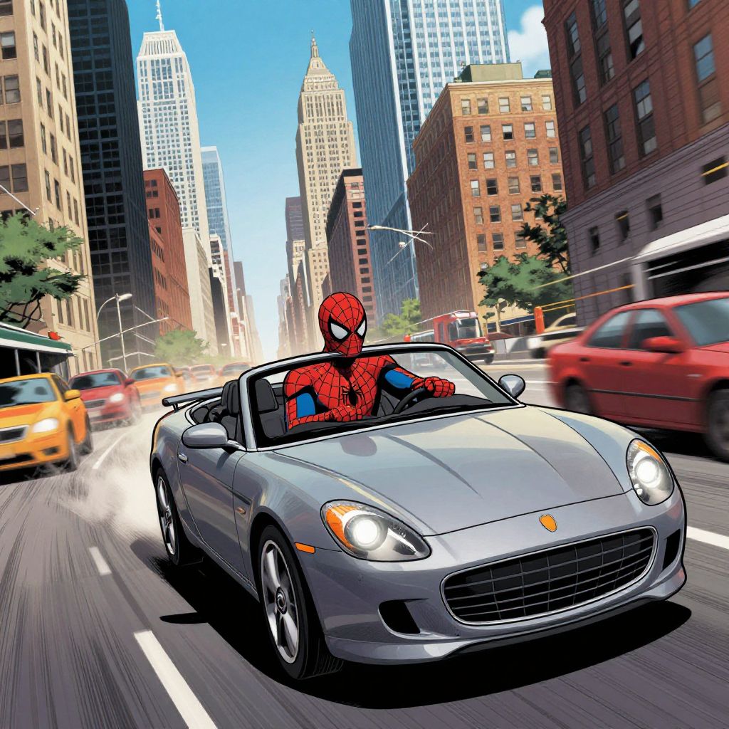Spiderman in a car, vibrant illustration of Spiderman as a casual driver in a compact city car, surrounded by animated street art, lively urban environment, playful and colorful style, early morning light with soft shadows, emphasizing character’s relaxed side