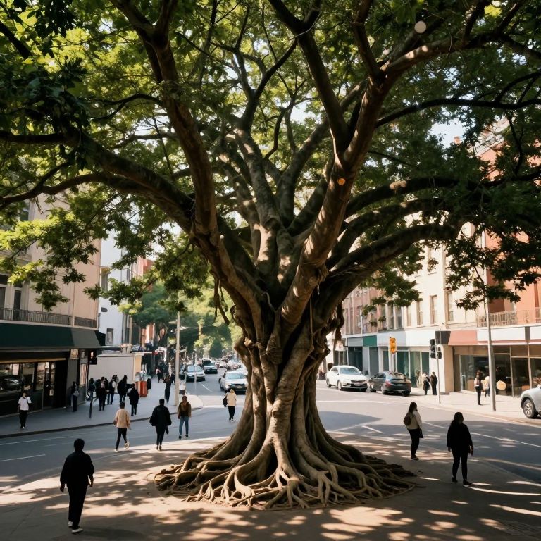 A surreal image captures an ancient tree towering over a bustling city street, its gnarled roots extending deep into the urban fabric. Viewed from a high vantage point, the colossal tree dominates the landscape, its branches weaving together to form an intricate canopy overhead. The juxtaposition of nature and civilization evokes a thought-provoking atmosphere as curious pedestrians stroll alongside the tree's trunk, seemingly unaware of its supernatural presence. Warm sunlight filters through the leaves, casting long, dancing shadows that blur the line between reality and fantasy, reminiscent of Magritte's enigmatic imagery without directly referencing him.