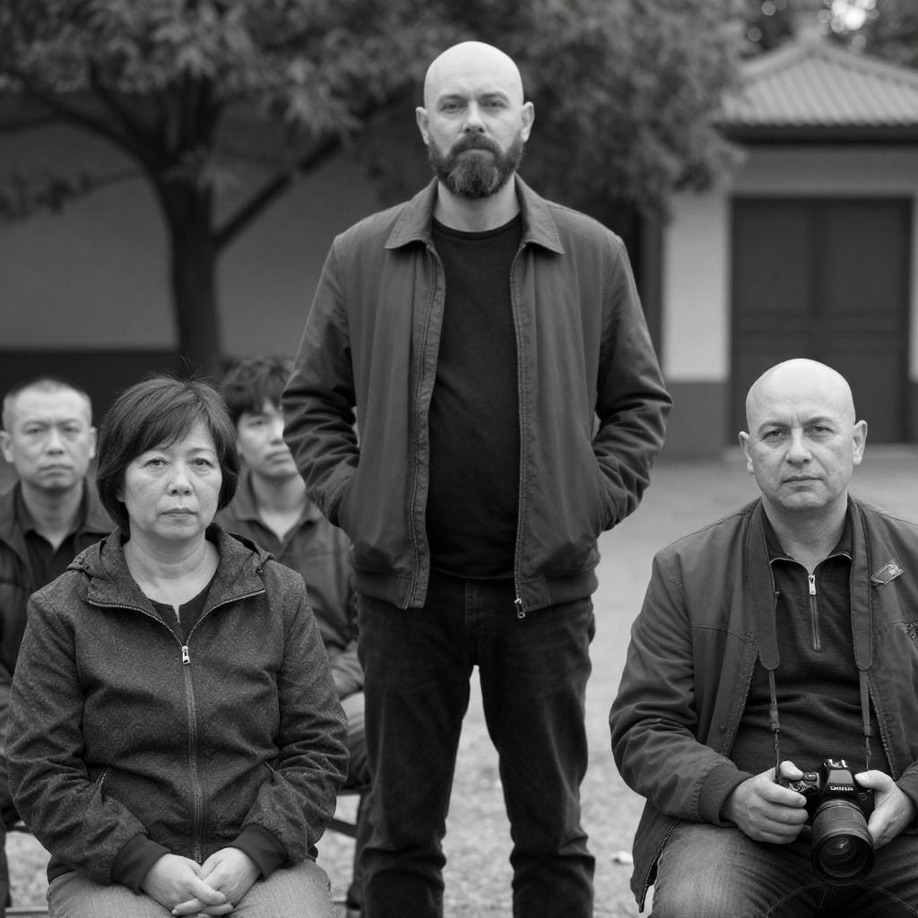 Black-and-white photograph of five people in an outdoor setting. A bald, bearded man in a dark jacket stands tall in the center. To his left, a woman with short hair and a patterned jacket sits, looking forward. To his right, a bald man in a jacket holds a camera. Two other individuals, partially obscured, sit in the background. Trees and a structure are visible behind them.