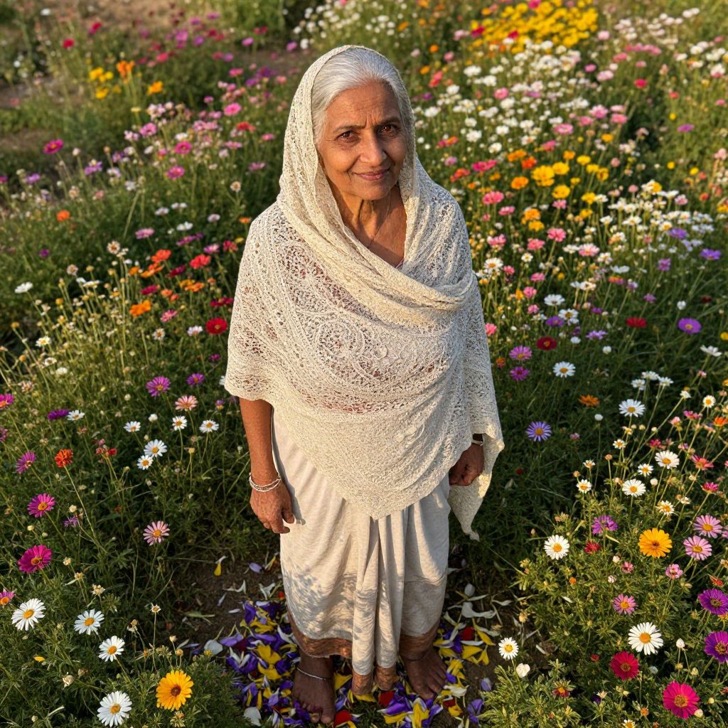 Photograph of an elderly Indian woman with a white lace headscarf and cream dress, smiling in a vibrant field of colorful wildflowers.