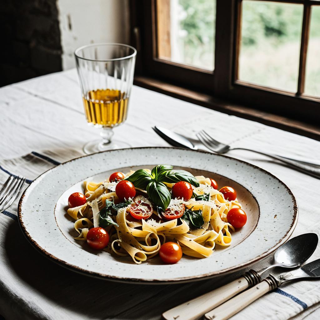Present a bright fruit tart with fresh berries and mint leaves on top, glistening glaze, and a dollop of whipped cream on a rustic pastel-colored ceramic plate on a vintage farmhouse table with soft natural light streaming from a nearby window, captured in soft focus, delicate pastel tones, dreamy fine art photography style.