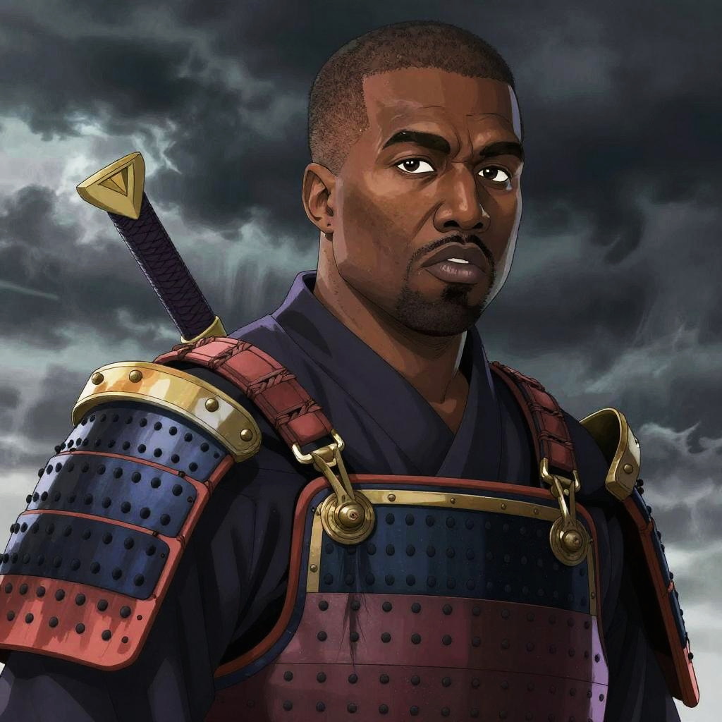 Kanye anime portrait with intense expression, blending streetwear and traditional samurai armor, set against a stormy sky, highly detailed shading and highlights, anime style emphasizing emotion and action, vibrant and moody atmosphere