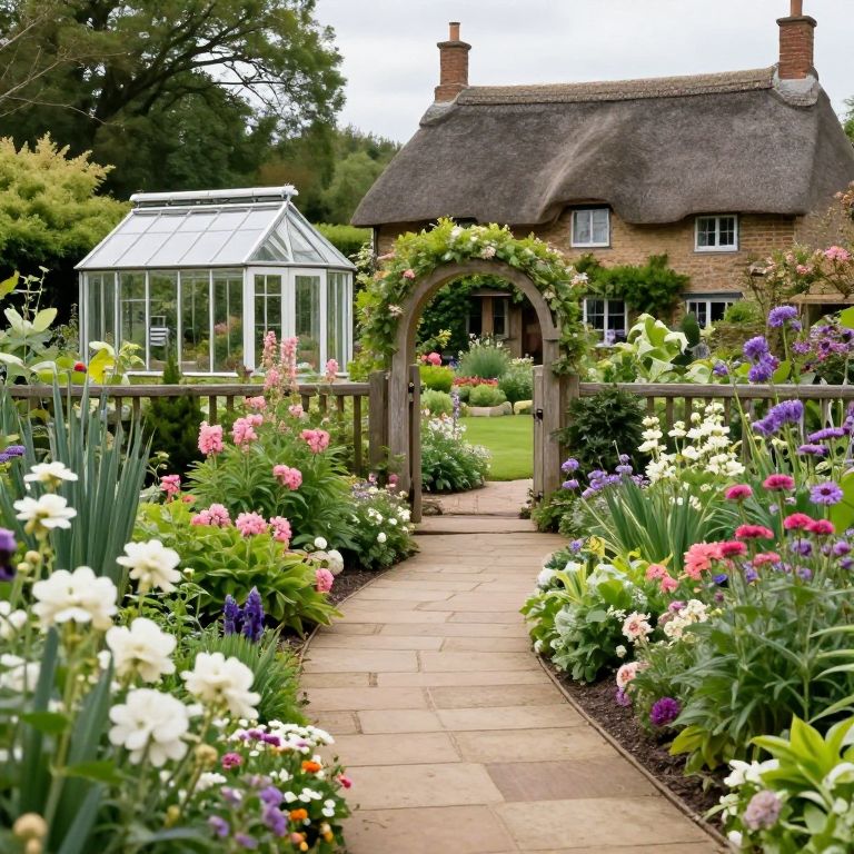 Photograph of a vibrant English cottage garden featuring a brick cottage with a thatched roof, surrounded by lush, colorful flower beds. A wooden archway, adorned with green vines, stands in the center of a stone pathway leading to a small, glass greenhouse on the left. The garden is filled with blooming flowers, including white, pink, purple, and yellow blossoms, with tall green plants and foliage. The background includes a tree and a clear sky. The scene is serene and picturesque, evoking a quintessential English countryside atmosphere.