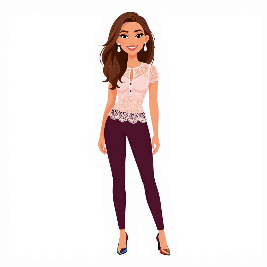 Woman with pretty face and pretty hair. smiling Woman, casual chic, lace overlay top in pale pink, short sleeves, keyhole neckline with single button closure, scalloped trim, dark burgundy skinny pants, ankle-length, metallic Oxford shoes with multicolor hues, white teardrop earrings, plain white studio background. --sref 1467