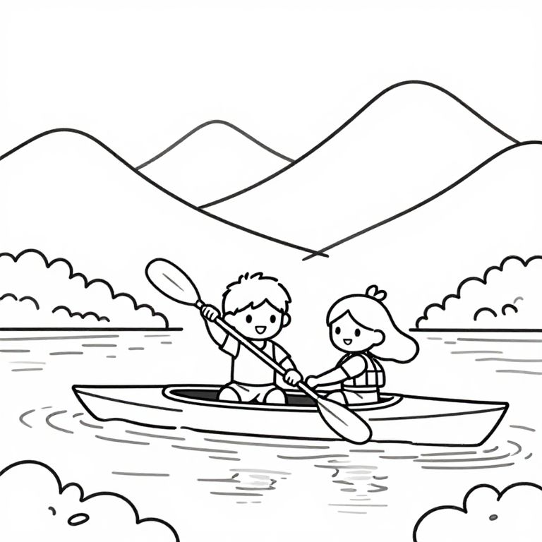 Needle a coloring page of 1 boy and a girl rowing a sports canoe on the river with a mountainous background, cute,