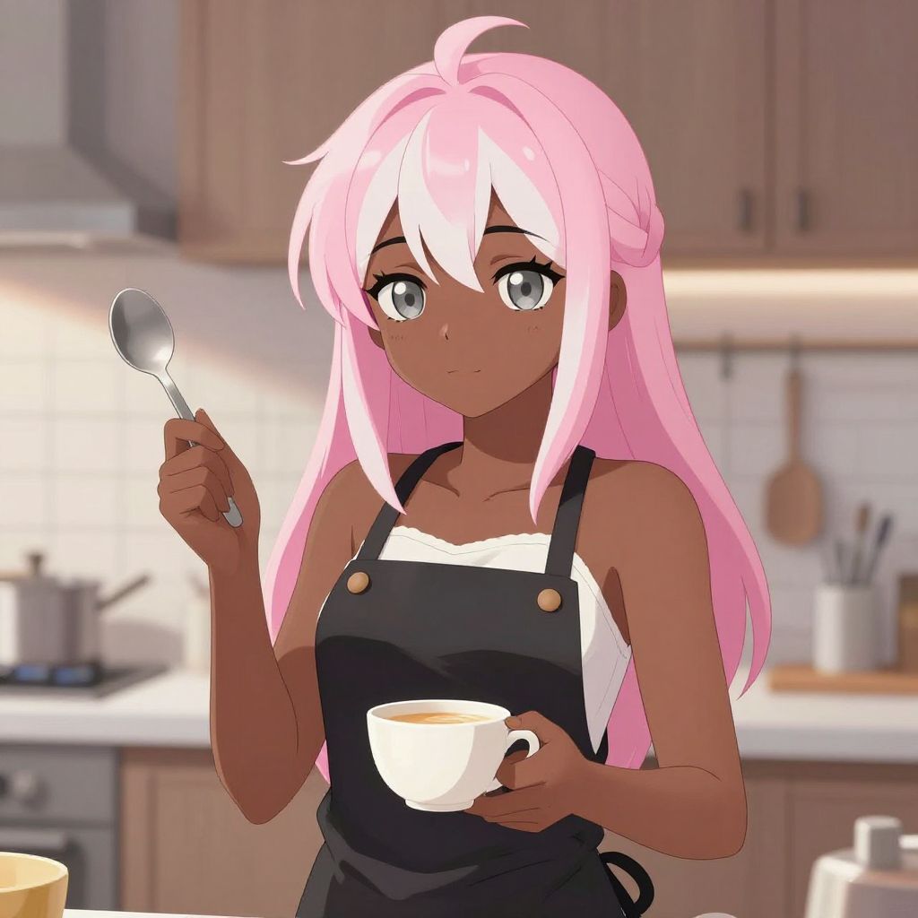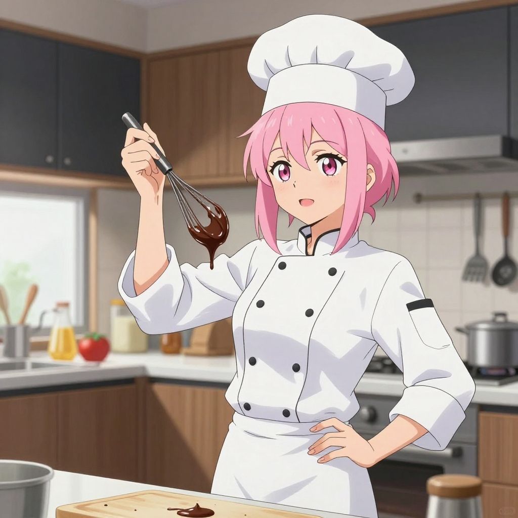 Anime-style illustration of a female chef with pink hair wearing a traditional white chef uniform and hat. She is holding a whisk dripping with melted chocolate in a modern kitchen with wooden and black cabinets, a large window, and various kitchen utensils and ingredients visible in the background.