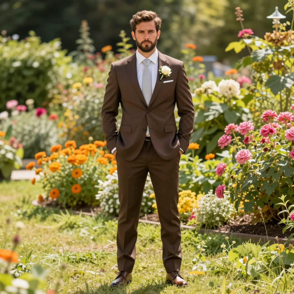 Little groom attire, photograph of handsome man standing in colorful garden, wearing brown suit, white shirt, light gray tie, white rose boutonniere, sunlight, green grass, bright orange and pink flowers in background, natural light, daytime, serious expression, well-groomed beard, brown hair, hands in pockets, summer, full body shot, realistic style, outdoors