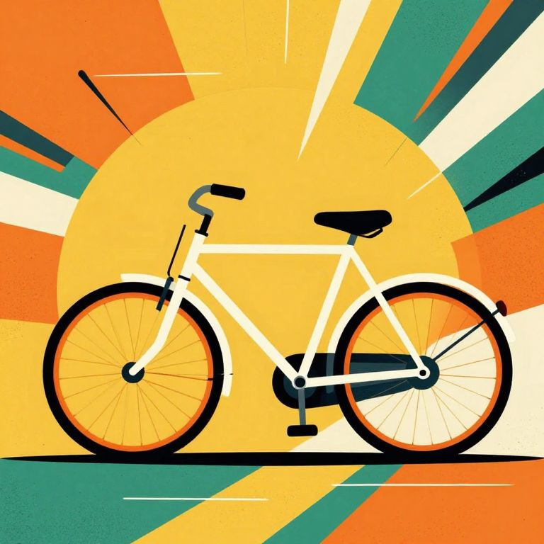 The image features a striking illustration of a bicycle, rendered in a retro art style reminiscent of Avant-Pop Heroic Constructivism. The bicycle, depicted in a minimalist yet dynamic manner, is set against a vibrant, abstract background composed of bold geometric shapes and dynamic lines. The bicycle itself is white, with black and orange accents on the wheels and handlebars, creating a stark contrast against the colorful backdrop. The background is a blend of warm and cool tones, with shades of yellow, orange, and green, interspersed with black and white lines that add a sense of movement and energy to the composition. The overall arrangement of the bicycle and background elements creates a sense of depth and dynamism, with the bicycle positioned centrally and slightly to the left, drawing the viewer's eye through the composition. The interplay of colors, textures, and shapes contributes to a visually engaging and balanced image, capturing the essence of the Avant-Pop Heroic Constructivism style.