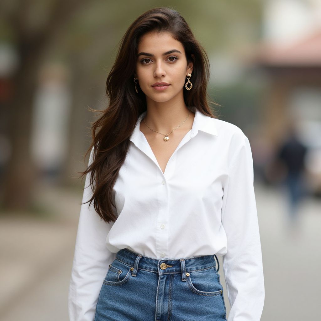 A lean woman in a cream satin blazer and high-waisted jeans stands in a vibrant outdoor cafe patio, embodying a casual chic style. She wears minimal jewelry and has understated makeup, with a plain white top visible beneath her blazer. The scene captures the essence of a cri film, highlighting her relaxed yet stylish demeanor amidst the lively atmosphere. Sexy. Pretty face and beаutiful eyes. Big breasts