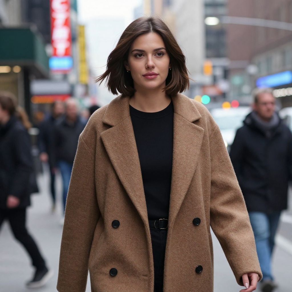 Photograph of a confident brunette woman with medium-length hair, wearing a white blouse, cream blazer, and blue jeans, walking outdoors at a bustling