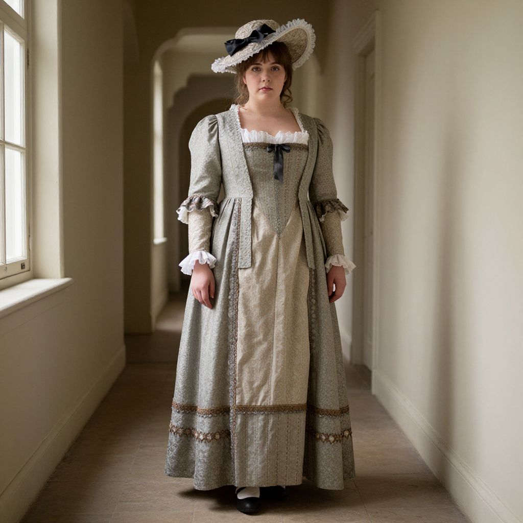 Plus Size 1800s Costume, woman in a long dress and hat standing in a hallway